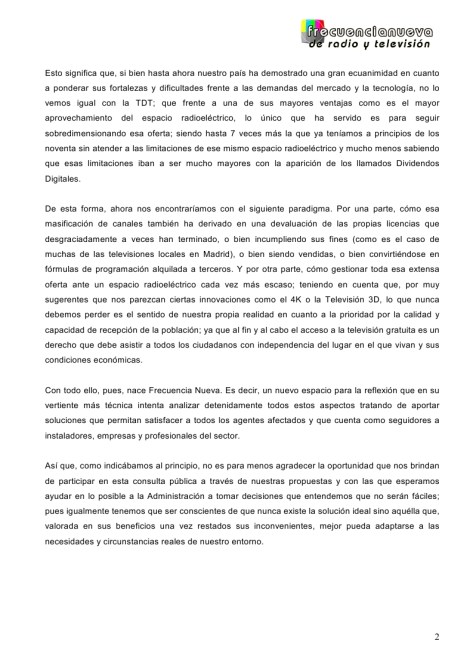 Y a ello añadiríamos más, ya que creemos fundamental la realización previa de un estudio técnico en las zonas geográficas más complejas (como es la relacionada con comunidades autónomas y provincias colindantes), a fin de que el nuevo plan técnico nacional sea mucho más robusto y acertado, y a lo cual hacemos referencia con diversas medidas y propuestas en respuesta a la pregunta número 4. También estamos de acuerdo en que el segundo Dividendo Digital no debe suponer un recorte de la actual oferta, pero debiendo introducir sistemas como el DVB-T2 que permitan precisamente su mantenimiento; ya que no vemos posible que sea de otro modo tras el reducido espacio radioeléctrico que quedará tras la liberación de la banda de los 700 Mhz (actuales canales 49 a 59 de UHF).