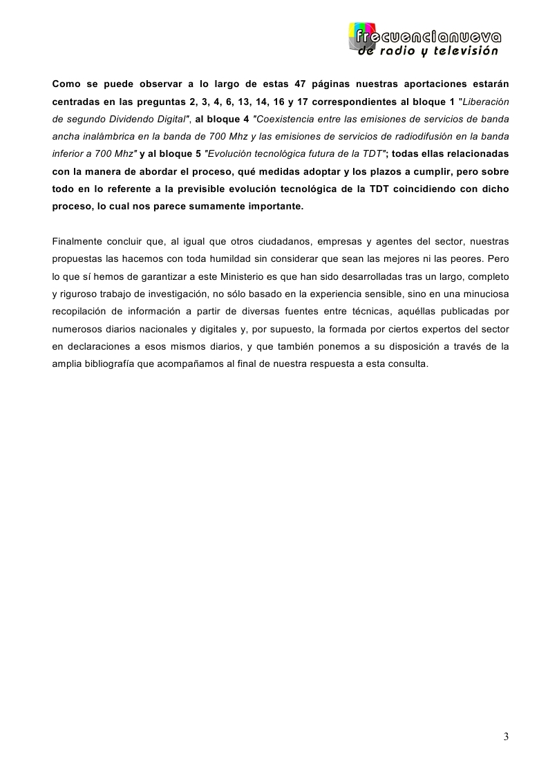 Así que de todo ello, pues, hablamos detenidamente a lo largo de todo nuestro documento respondiendo a las diferentes preguntas correspondientes al bloque 1 «Liberación de segundo Dividendo Digital», al bloque 4 «Coexistencia entre las emisiones de servicios de banda ancha inalámbrica en la banda de 700 Mhz y las emisiones de servicios de radiodifusión en la banda inferior a 700 Mhz» y al bloque 5 «Evolución tecnológica futura de la TDT»; en lo que se trata, como decimos, de todo un trabajo muy elaborado, que no sólo se limita a responder, sino también a explicar y a aportar medidas, propuestas y soluciones, como es nuestra filosofía, que puedan satisfacer a todos los agentes afectados y al cual le acompaña también toda una extensa bibliografía; como corresponde a la seriedad de nuestros artículos y publicaciones.