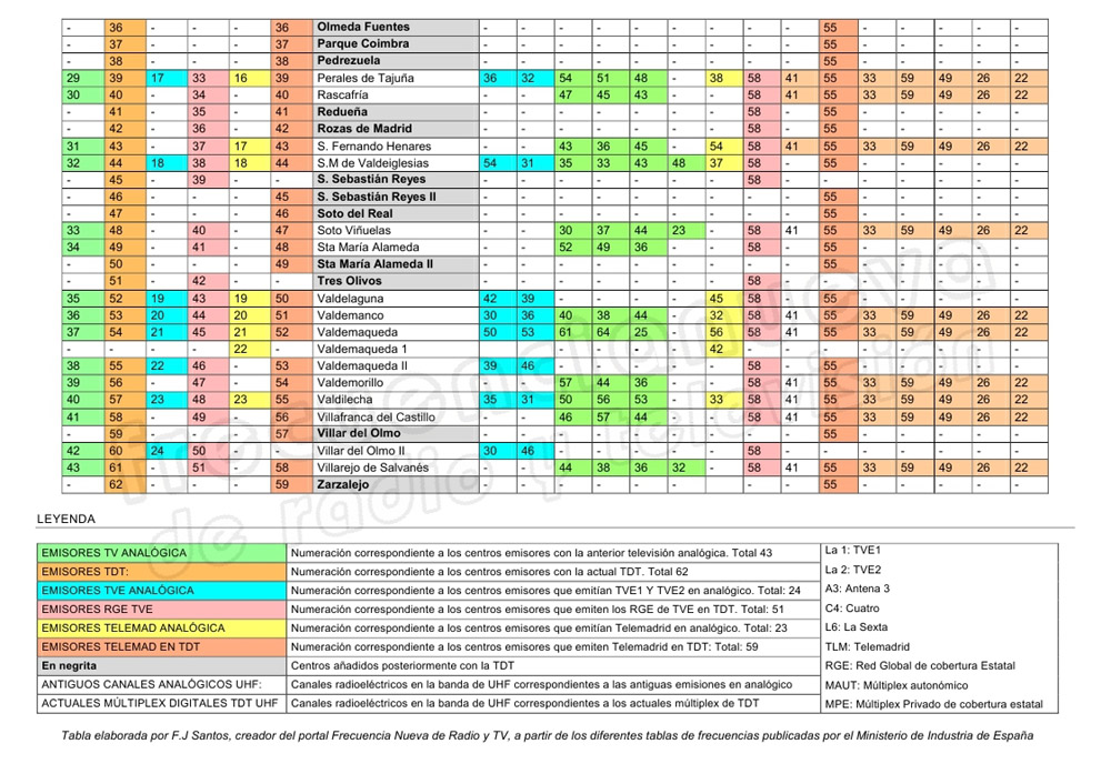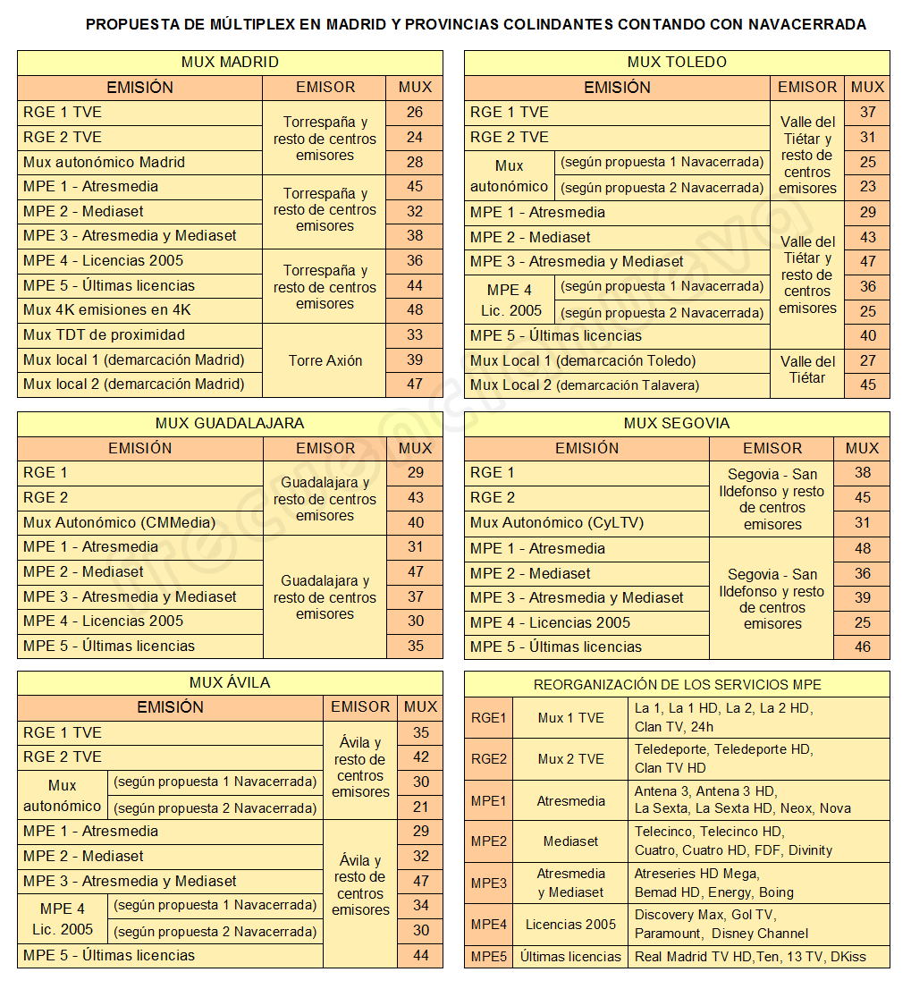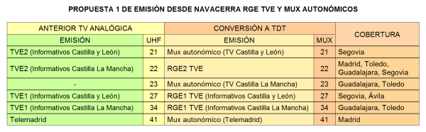 De esta forma, siguiendo la misma fórmula ya expuesta en artículos anteriores, es decir, la de hacer corresponder los canales radioeléctricos utilizados por cada operador durante la anterior televisión analógica en lo que sería su conversión a los nuevos múltiplex de TDT, el resultado sería la siguiente tabla que presentamos a continuación; disponiendo el RGE1 de TVE para las provincias de Segovia y Ávila en el canal 27, el RGE1 de TVE para las provincias de Toledo y Guadalajara en el canal 34, el múltiplex autonómico de Castilla La Mancha para las provincias de Toledo y Guadalajara en el canal 23, el múltiplex autonómico de Madrid para su respectiva comunidad autónoma en el canal 41 y finalmente el múltiplex autonómico de Castilla y León para la provincia de Segovia en el canal 21.