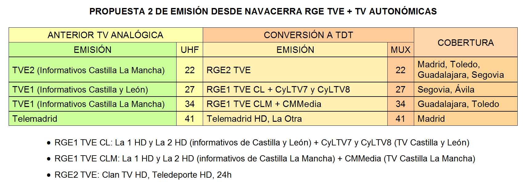 De esta forma el RGE1 de TVE en el canal 34 de UHF dirigido a las provincias de Toledo y Guadalajara quedaría con las emisiones de La 1 HD y La 2 HD para Castilla La Mancha, pero incorporando también las de la autonómica CMMedia para esas mismas provincias. E igualmente el RGE1 en el canal 27 dirigido a Segovia con las emisiones de La 1 HD y la 2 HD para Castilla y León incorporaría a su vez la emisión de la Televisión de Castilla y León para esa misma provincia, que en este serían las cadenas CyLTV7 y CyLTV8.
