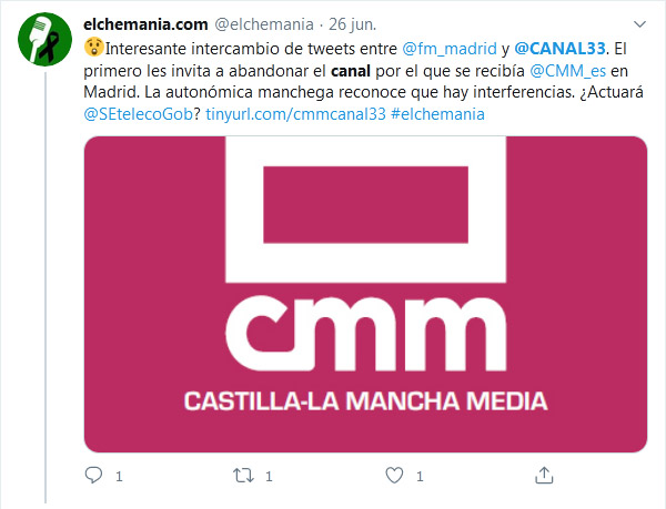 Del tono, la polémica y los comentarios vertidos en Twitter, es posible que muchos ciudadanos piensen en la intencionalidad por parte de Canal 33 de utilizar precisamente el múltiplex en el que emite Castilla La Mancha en Toledo y que, por cuestiones inevitables de carácter geógrafico, permite también que se vea en parte del sur de la Comunidad de Madrid.