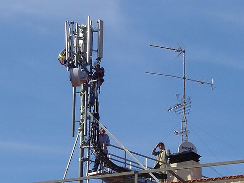 Antenas de televisión situadas justo al lado de una estación emisora de telefonía móvil